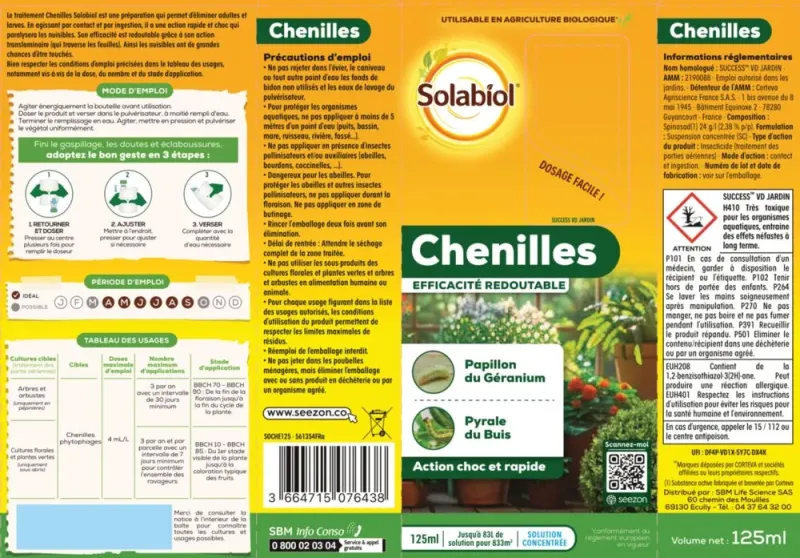 ATTENTION : l'insecticide Chenilles Solabiol n'est pas un produit sélectif de lutte contre les ravageurs. Il agit sur tous les insectes ayant été à son contact ou l'ayant ingéré.