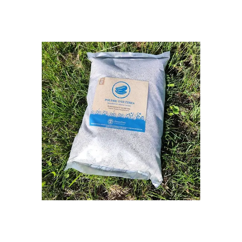 Poudre de coquilles d’huîtres issues de fermes ostréicoles bretons. Chaque coquille d'huitre est broyée à une granulométrie de 160 microns pour une action rapide dans le sol. C'est un amendement minéral basique riche en calcaire et utilisable en agriculture biologique.