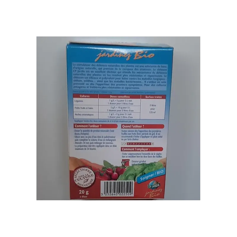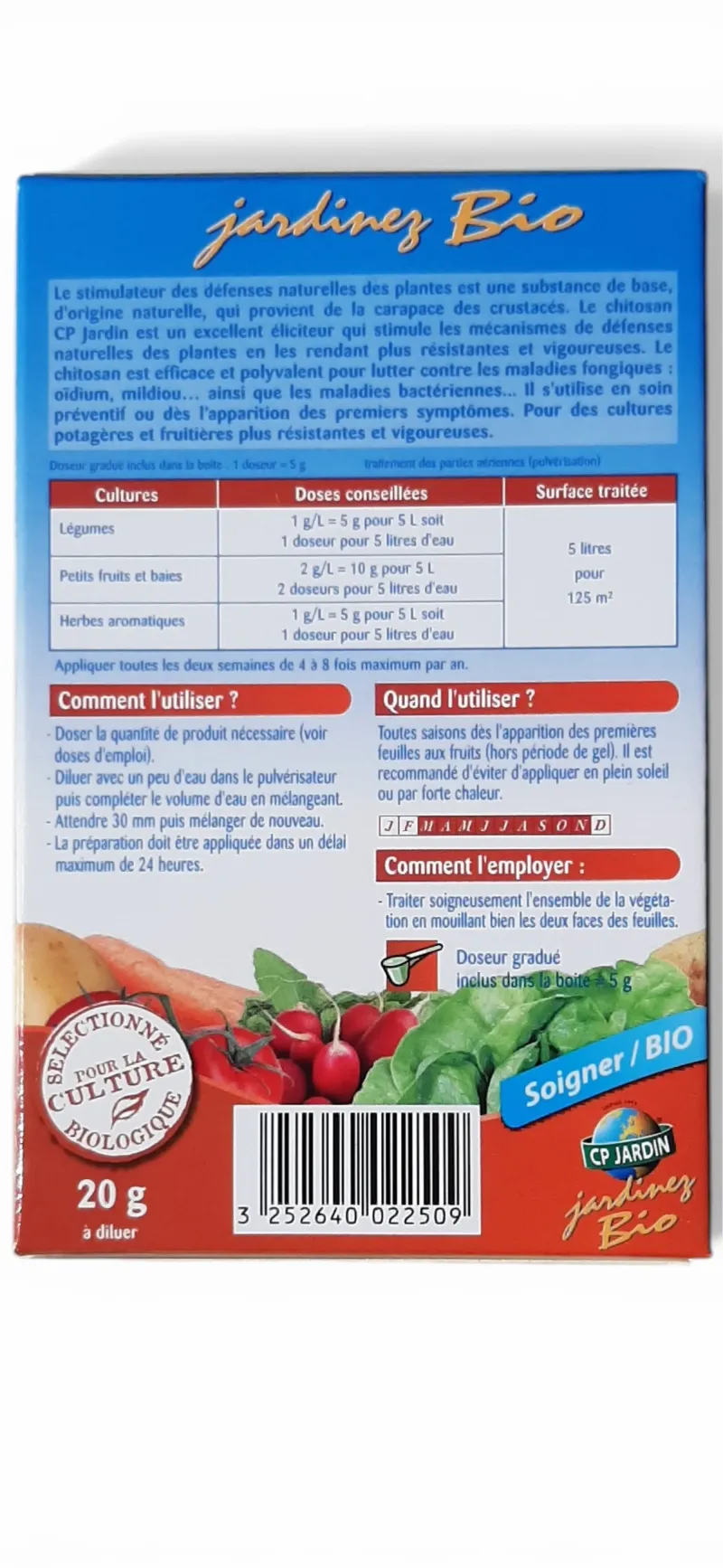 Afin d’obtenir une efficacité optimale contre les maladies, nous vous recommandons de combiner les modes d’action. Pour cela, appliquez en alternance avec le chitosan, d’autres stimulateurs de défenses naturelles des plantes à l’instar de l’anti-maladie polyvalent ainsi que de la lécithine ou de la décoction de prêle en respectant les usages préconisés.