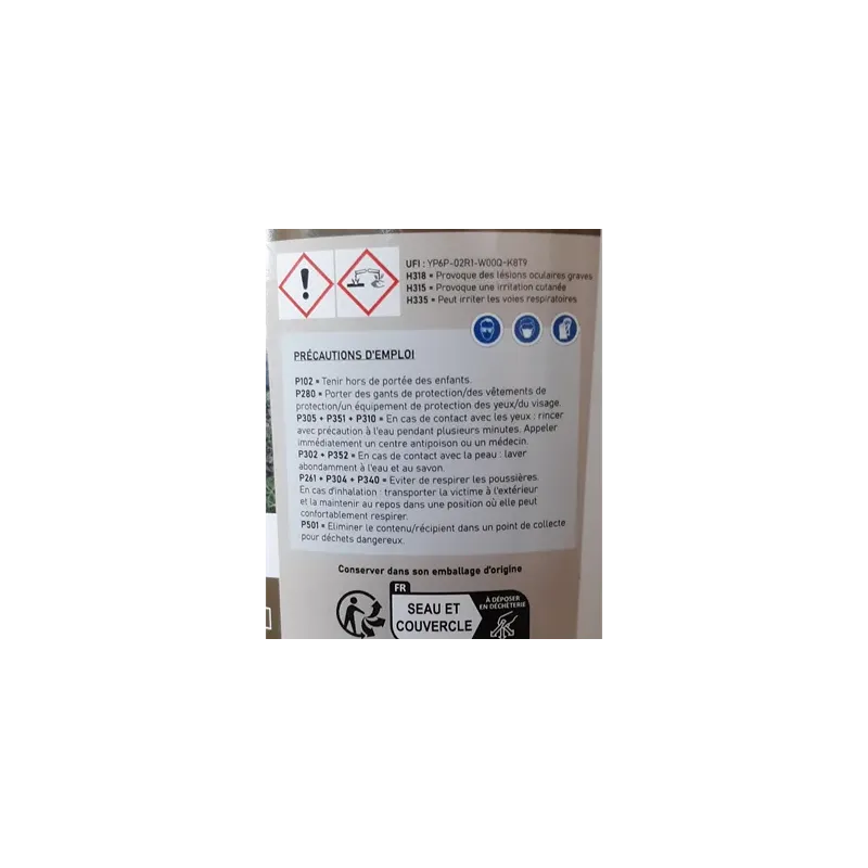 Conseils de prudence et précautions d'emploi : P102 : Tenir hors de portée des enfants. P261 : Eviter de respirer les poussières, vapeurs, brouillards, aérosols. P280 : Porter des vêtements de protection / un équipement de protection des yeux / du visage, des gants de protection. P302 + P352 : EN CAS DE CONTACT AVEC LA PEAU : laver abondamment à l'eau et au savon. P304 + P340 : EN CAS D'INHALATION / transporter la victime à l'extérieur et la maintenir au repos dans une position où elle peut confortablement respirer. P305 + P351 : EN CAS DE CONTACT AVEC LES YEUX : Rincer avec précaution à l'eau pendant plusieurs minutes. Enlever les lentilles de contact si la victime en porte et si elles peuvent être facilement enlevées. Continuer à rincer. P310 : Appeler immédiatement un CENTRE ANTIPOISON ou un médecin. P501 : Eliminer le contenu / récipient dans le lieu d'élimination conformément à la réglementation locale.