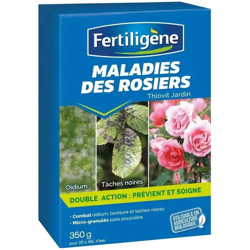 L’anti maladies des rosiers Fertiligène est un fongicide à base de soufre d’origine minérale, conçu pour aider à protéger les rosiers contre les maladies cryptogamiques les plus courantes, notamment l’oïdium et les taches noires. Son action à la fois préventive et curative en fait une solution simple à intégrer dans l’entretien des rosiers au jardin.